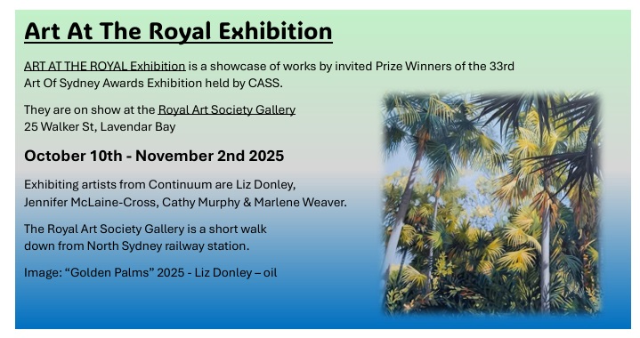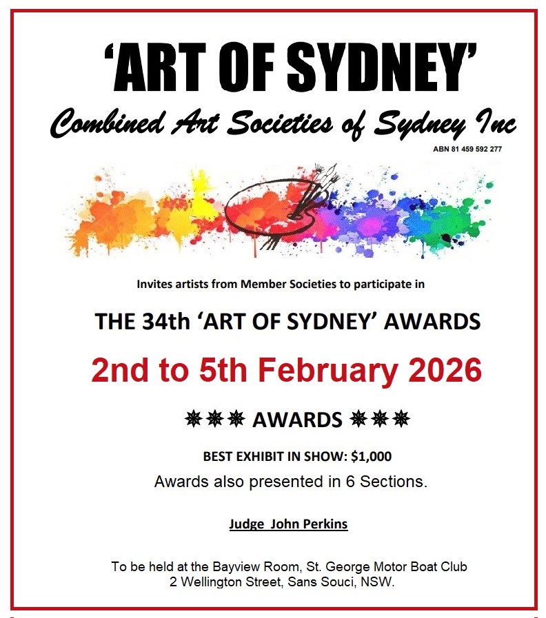 Being a member of the Combined Art Societies of Sydney (CASS), many of our CAS members participated in their Art of Sydney Awards Exhibition, which was another successful event held from 21st to 25th March 2025.